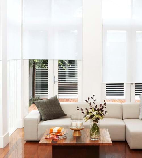 Roller Blinds offer a Modern Design for an affordable price. Roller Blind are usually placed inside the window frame for a clean look, and for better insulation. They can also be placed outside of the window frame to lengthen an opening. A Microsheen fabric Roller Blind can provide daytime privacy, as well as prevent sun glare, and fading to furniture and flooring during the day. You can combine this with a Transluscent Fabric for a feature, or a Blockout fabric for night-time privacy.